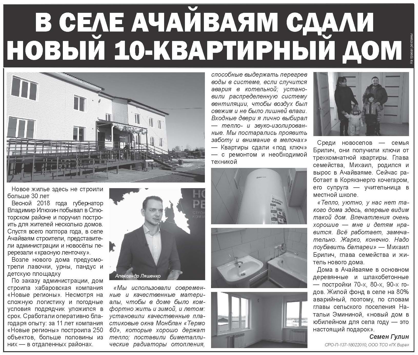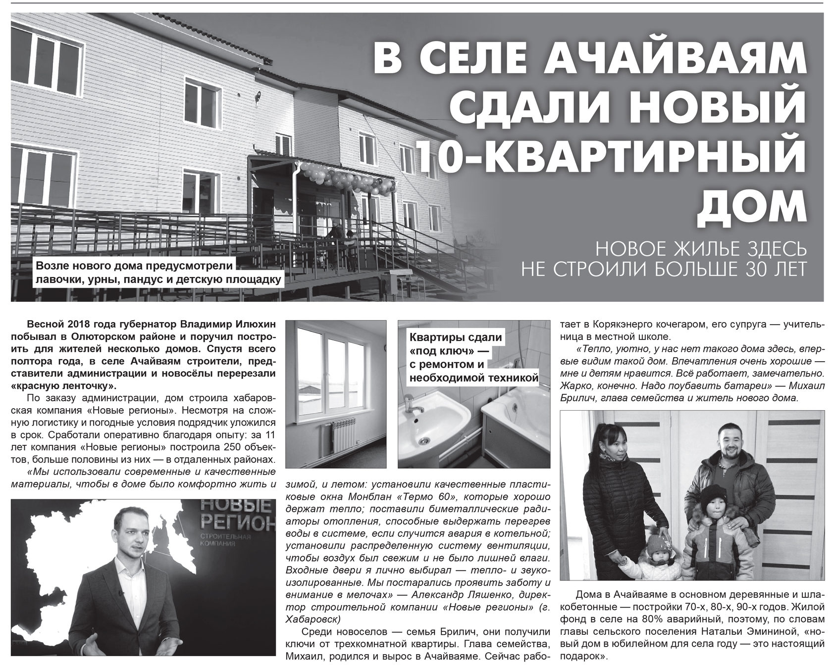 Весной 2018 года губернатор Камчатского края Владимир Илюхин побывал в Олюторском районе и поручил построить для жителей несколько домов. Перед нами была задача за полтора года возвести десяти-квартирный дом в селе Ачайваям, чтобы попасть в программу расселения.